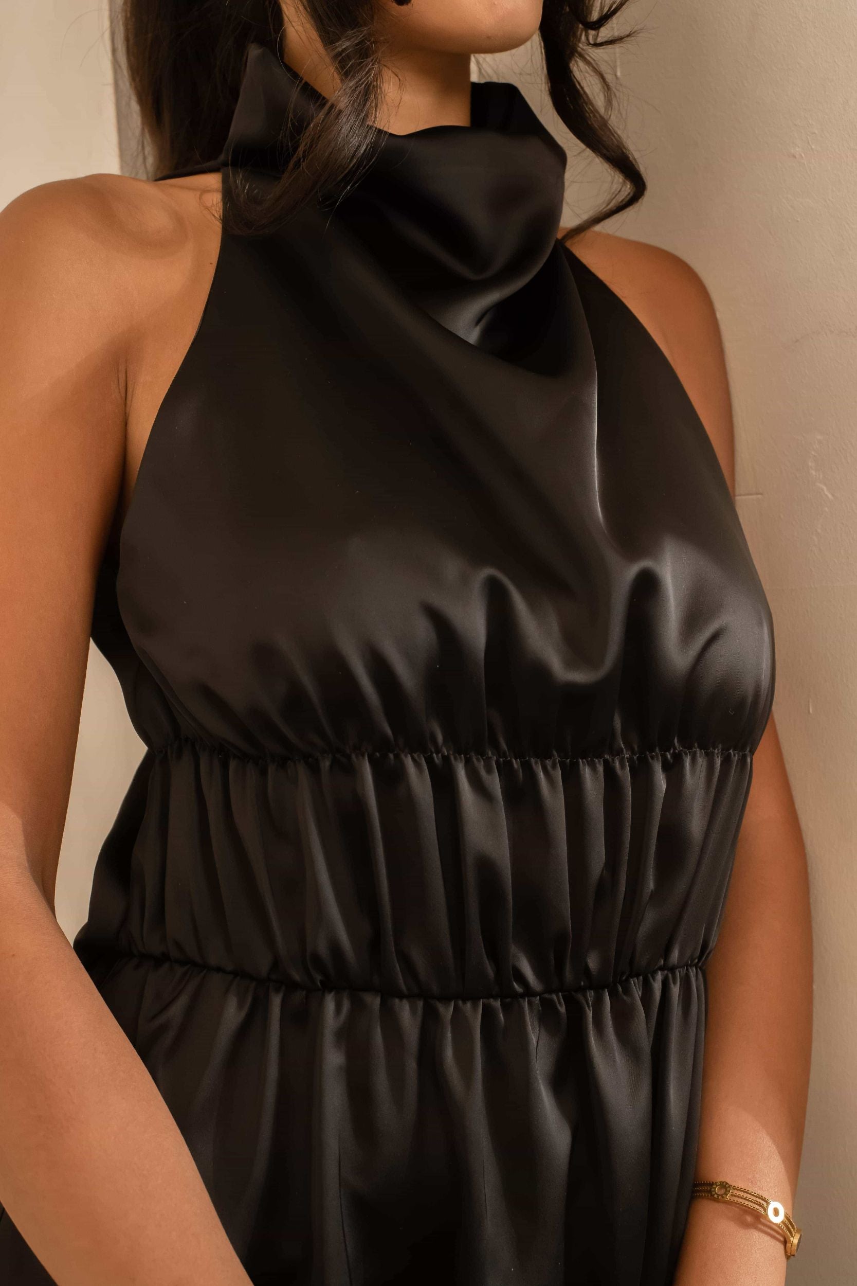 Elegant but never loud. Bellina commands attention through simplicity - a high neckline, an open back, and a cut that celebrates shape, not trend. The satin drapes close to the body, catching the light with every step. Graceful, confident, and enduring.